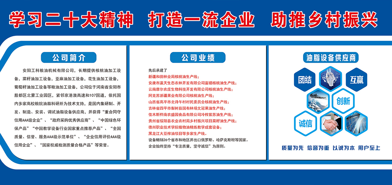 安陽工科糧油機(jī)械有限公司,長(zhǎng)期提供核桃油加工設(shè)備,茶籽油加工設(shè)備,菜籽油加工設(shè)備,亞麻油加工設(shè)備,花生油加工設(shè)備,葡萄籽油加工設(shè)備等糧油加工設(shè)備,公司位于河南省安陽市殷都區(qū)北蒙工業(yè)園區(qū),緊鄰京港澳高速和107國(guó)道,依托國(guó)內(nèi)多家高校糧院油脂科研所為技術(shù)支持,是國(guó)內(nèi)集研制、開發(fā)、制造、安裝、調(diào)試油脂設(shè)備供應(yīng)商,并獲得“重合同守信用AAA級(jí)企業(yè)”、“政府采購優(yōu)秀供應(yīng)商”、“中國(guó)綠色環(huán)保產(chǎn)品”“中國(guó)教學(xué)設(shè)備行業(yè)國(guó)家重點(diǎn)推薦產(chǎn)品”、“全國(guó)質(zhì)量、信譽(yù)、服務(wù)AAA級(jí)示范單位”、“企業(yè)信用評(píng)價(jià)AAA級(jí)信用企業(yè)”、“國(guó)家權(quán)威檢測(cè)質(zhì)量合格產(chǎn)品”等榮譽(yù)。先后承建了新疆和田林業(yè)...